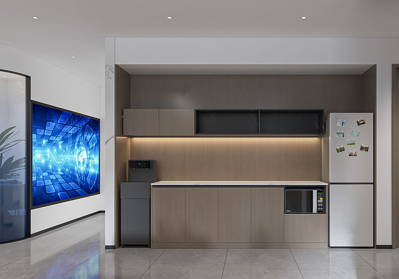 會議區(qū)選用灰白拼接辦公椅,搭配長條會議桌,適配團(tuán)隊(duì)協(xié)作需求;大屏顯示設(shè)備與墻面綠植相襯,在實(shí)用功能中注入活力。整體布局貼合濟(jì)南辦公室裝修的實(shí)用與美學(xué)結(jié)合趨勢,既滿足企業(yè)技術(shù)交流場景,又彰顯科技公司的專業(yè)質(zhì)感。